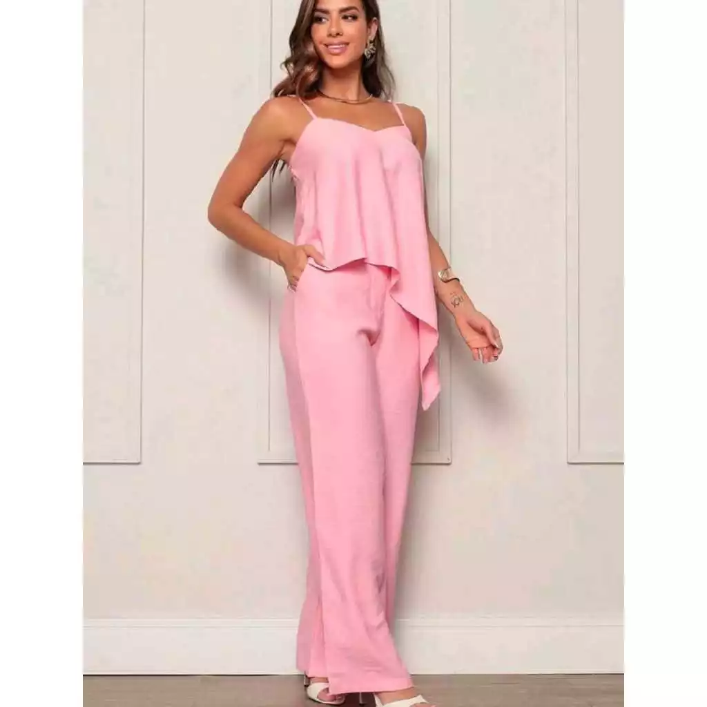 Conjunto elegante e versátil, confeccionado em tecido Duna de alta qualidade. Acompanha calça pantalona com caimento impecável e blusa de alças finas com barra assimétrica, que valoriza a silhueta e traz um toque moderno ao look. Ideal para ocasiões casuais, passeios ou eventos, garantindo conforto e sofisticação.