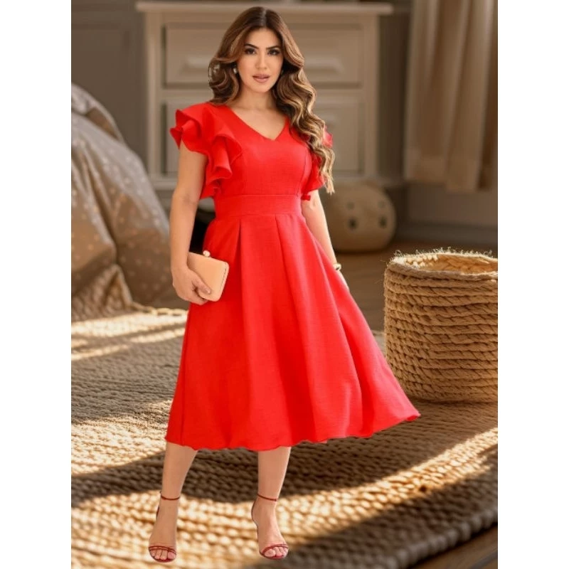 Vestido Midi Femenina Mangas Babados.